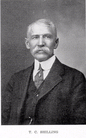 T. C. SHILLING T. C .SHILLING, of the firm of Shilling & Roberts, leading furniture dealers and undertakers of Troy, Ohio, has been engaged in the mercantile business in this city for a period of over forty years. He was born in Columbus, Ohio, in 1845, and is a son of Jesse Shilling, who prior to his death was one of the prominent and active citizens of Troy. Jesse Shilling, a son of William and Hannah Shilling, was born in Maryland, in 1825, and was about two years of age when his parents removed to Columbus, Ohio. There he was reared and educated, and when twenty-one years old was foreman of the Hayden Foundry, at Columbus, Ohio. He acquired considerable skill as an engineer and followed that occupation for years. In 1854 he moved to Troy and soon afterward agitated the establishment of a fire department here. Largely through his activity the project was favorably acted upon and he was installed as the first engineer of the department. He was always among the foremost in furthering the city's interests, being one of the founders of the present water works system, and was most highly esteemed by his fellow citizens. During the war he was provost-marshal of Miami County under Captain A. C. Duel. He also served as a member of the City Council. T. C. Shilling attended school in Columbus until his parents moved to Troy in 1854, and then attended school here until the Civil War was in progress. He enlisted as a member of Company H, 147th Regiment, Ohio Volunteer Infantry. Upon his return from the front he engaged in the dry goods business for some years, and then formed a partnership with Mr. Bond, under the firm name of Bond and Shilling, in the furniture and undertaking business. The partnership continued sixteen years, when upon the death of Mr. Bond, Mr. Roberts became a partner, the firm name being changed to Shilling & Roberts. This is the oldest firm of furniture dealers and undertakers in the city, and commands a liberal patronage at the hands of the people. Mr. Shilling was married at Fort Wayne, Indiana, to Miss Jennie Hartzell, and they have two sons, Eugene and Wade, both of whom are identified with the business of Shilling & Roberts. Mr. Shilling takes a deep interest in local politics, but with the exception of service on the School board, has filled no public office, being strictly a man of business. Fraternally, he is a member and has filled all the chairs of the following lodges: Blue Lodge, F.& A.M.; Chapter; Odd Fellows; Knights of Pythias; also a member of the Knights Templar. He is also past commander of the local post, G.A.R. Religiously, he is a member of the Baptist Church. Return to the Biography Index Copyright © 1998 by Computerized Heritage